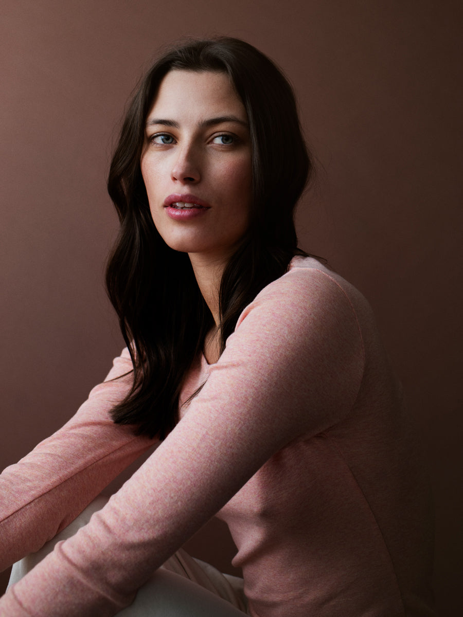 Es ist etwas schmaler geschnitten, hat lange Ärmel und einen schönen Rundhalsausschnitt. Der anschmiegsame Strick besteht aus dem ikonischen Melange-Garn und hat eine unglaubliche Farbtiefe. Er ist hier in der neuen Farbe „Coral“ erhältlich, einem wunderschönen, warmen Rosaton.