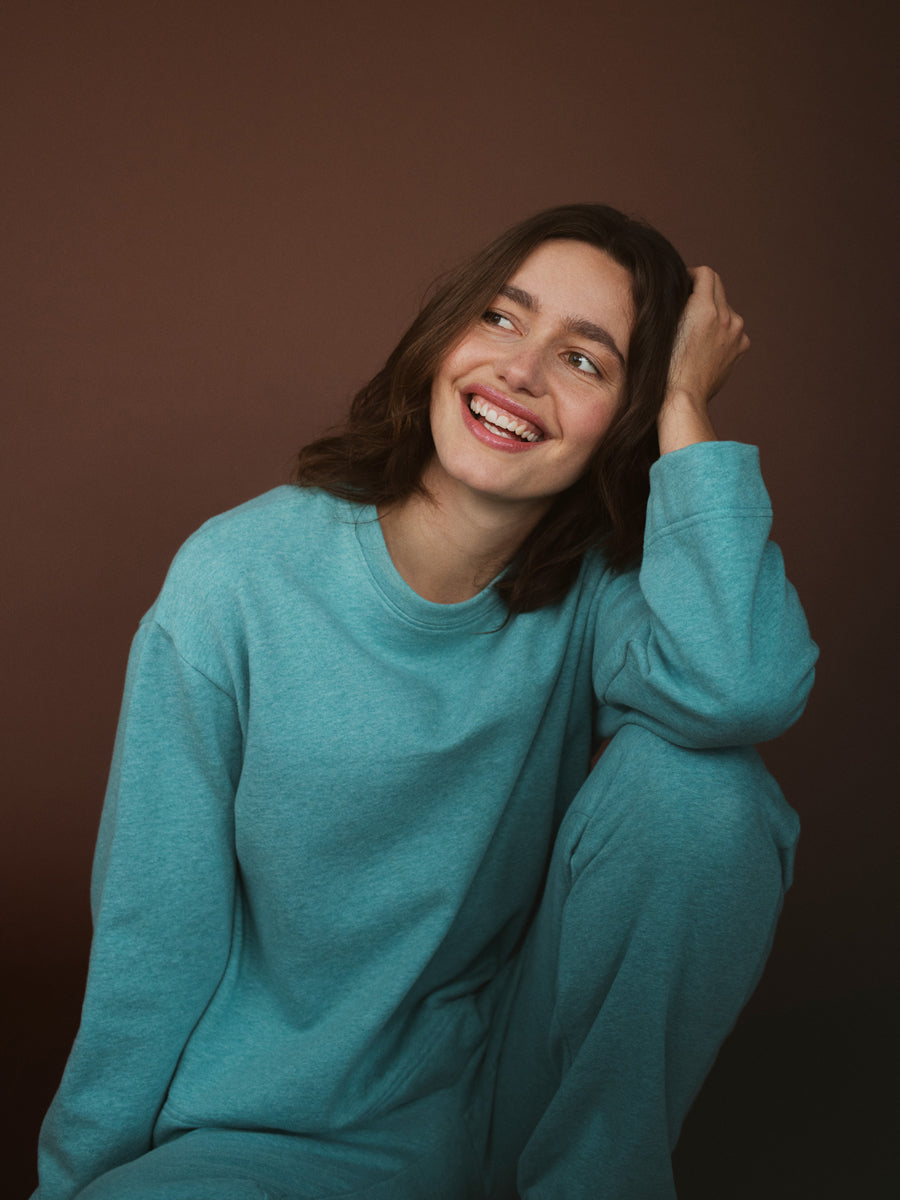 Der Sweater ist aus dem ikonischen Melange-Garn gestrickt, wodurch er eine unglaublich lebendige Farbe hat – hier in "Nile", einem wunderschönen Türkis.
