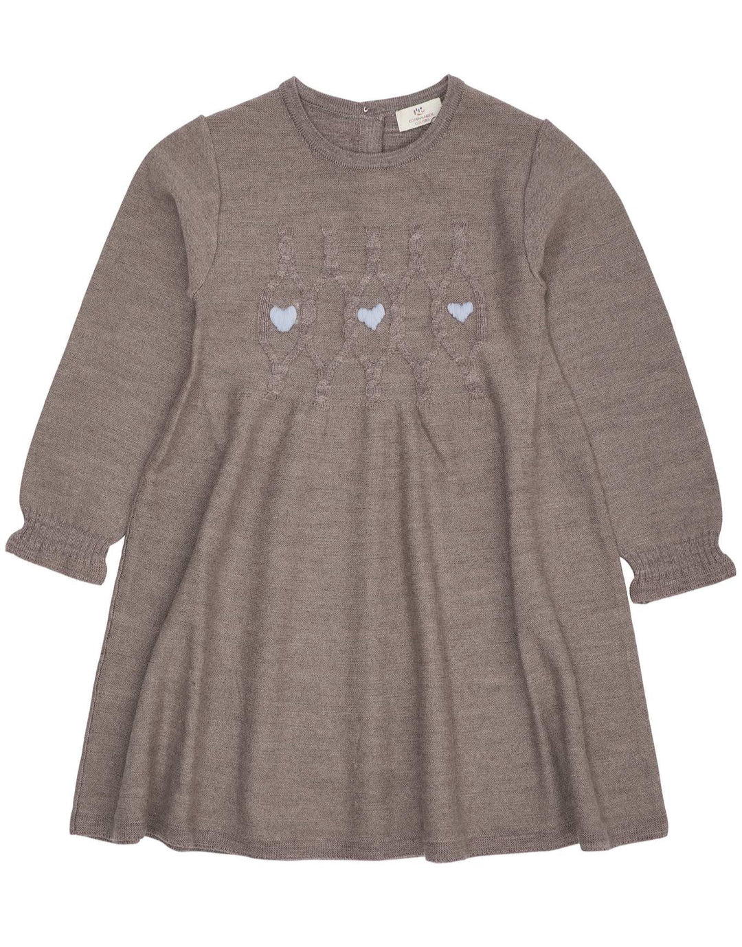 Vom dänischen Label Copenhagen Colors stammt dieses wunderschöne Kinderkleid im feinen Wollstrick mit liebevollen Strickmustern und aufgestickten Herzen. Es ist aus weichster, reiner Merinowolle gestrickt. Es ist sehr angenehm zu tragen, hat einen leichten ausgestellten Schnitt und lange Ärmel mit gekräuselten Abschlüssen. Wir finden es eignet sich sowohl für den Alltag als auch für besondere Anlässe. Die Größen fallen groß aus.